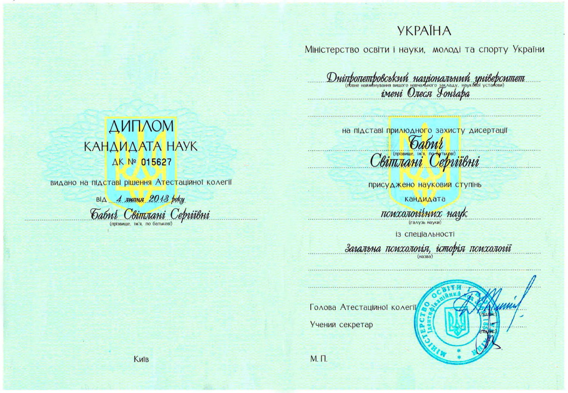 В 2013г. защитила диссертацию и получила кандидатскую степень, являюсь преподавателем кафедры психологии.