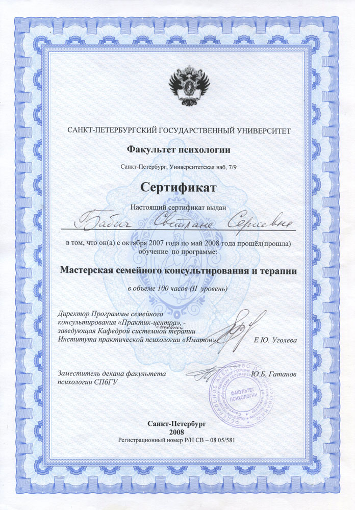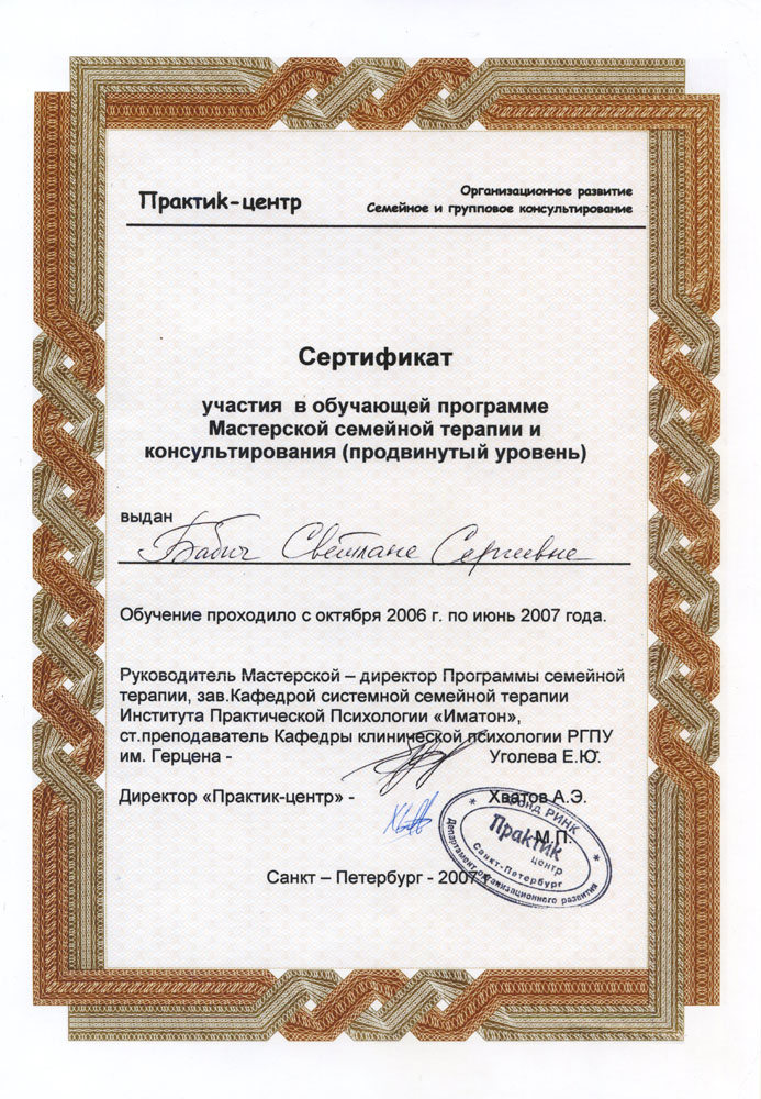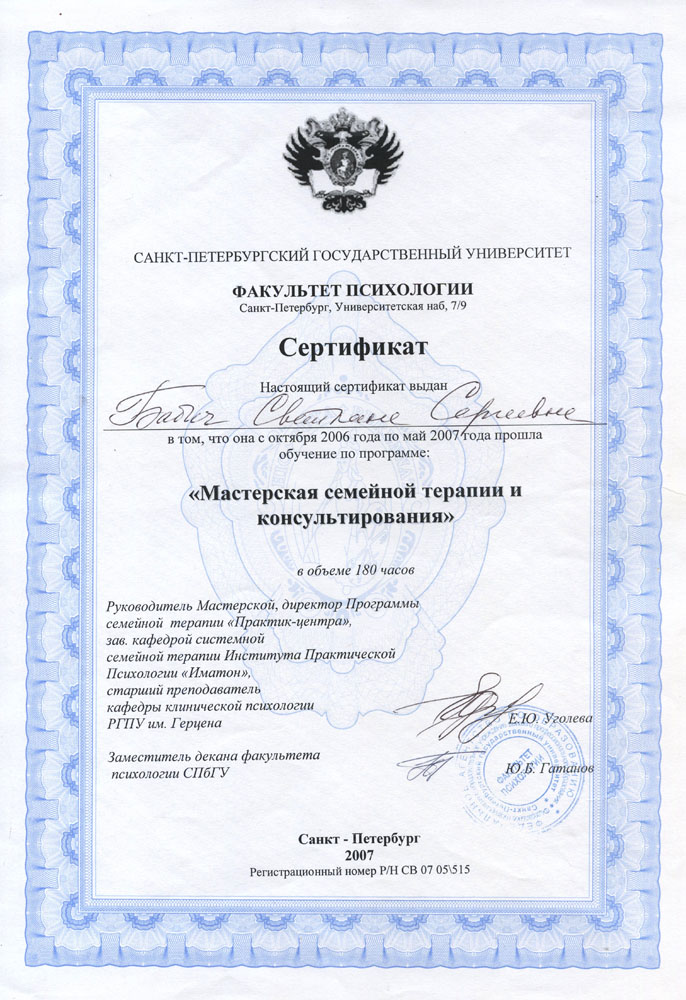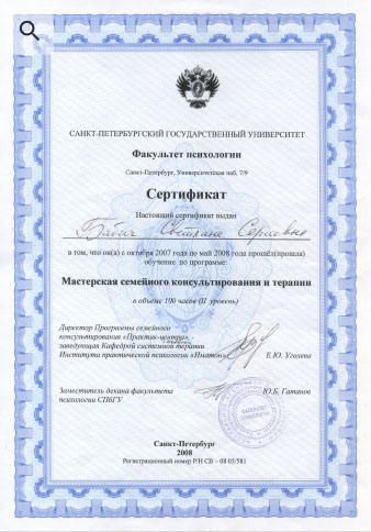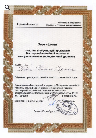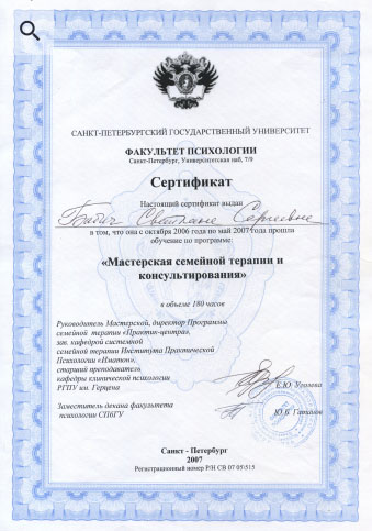 В 2006-2008гг. прошла программу Мастерской семейной терапии и консультирования при Институте Практической психологии «Иматон» Санкт-Петербургского государственного университета.